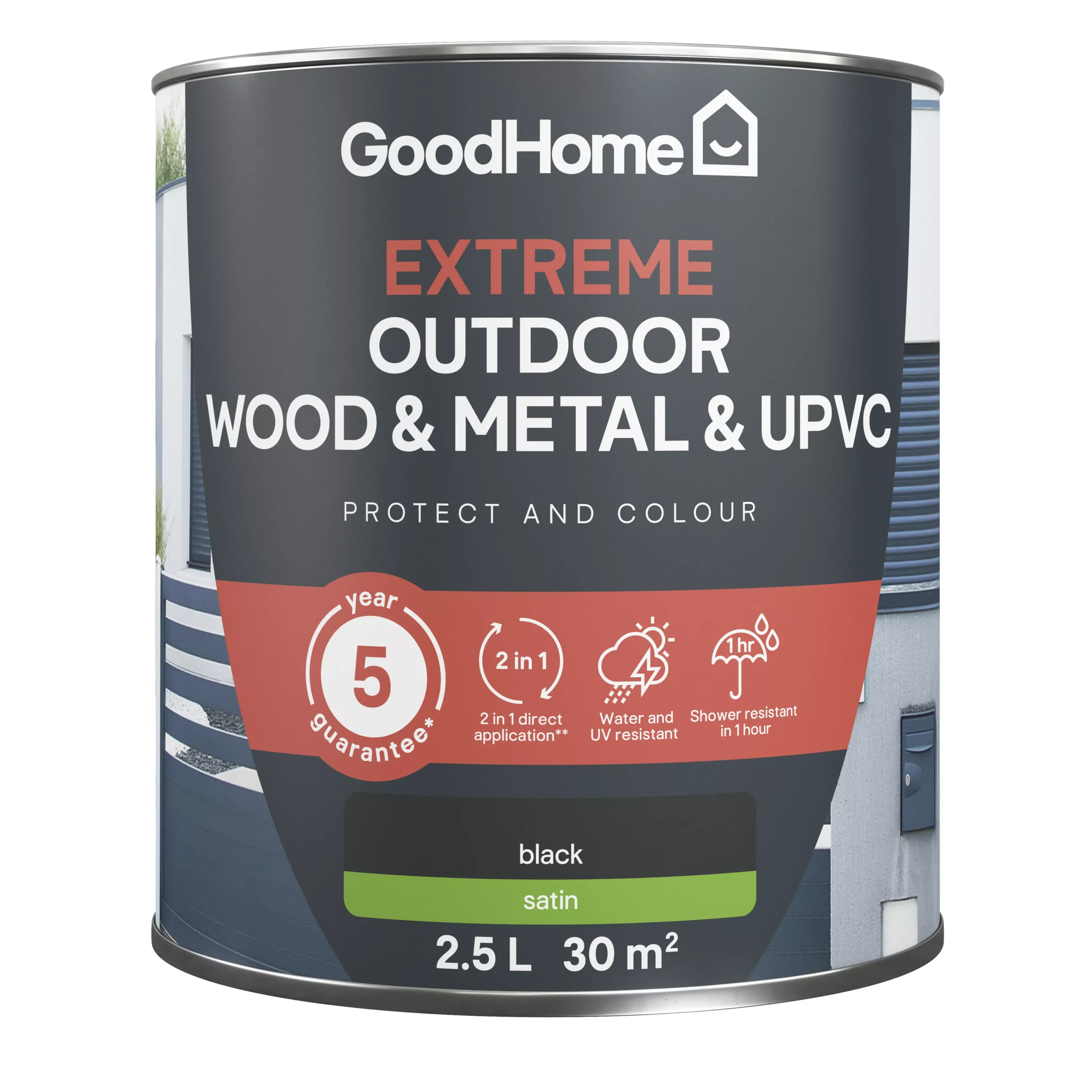 Give your outdoor wood, metal and plastic projects extreme protection and excellent colour with this GoodHome paint, ideal for use on a range of surfaces from window frames, front doors, to railings and garden furniture.