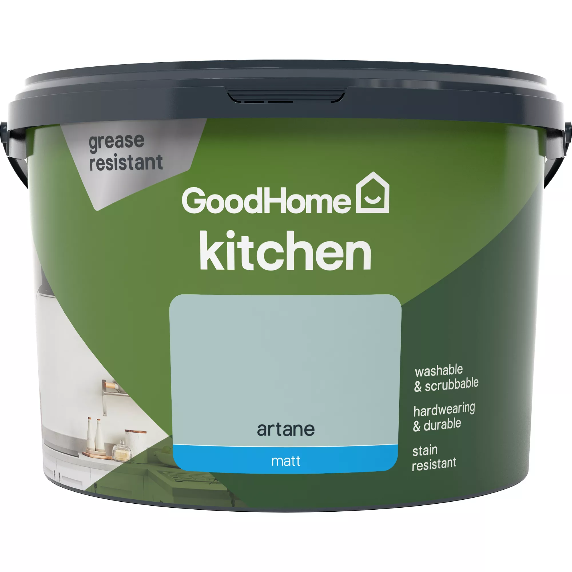 This matt emulsion paint from the GoodHome Kitchen range is the perfect choice to renew your home interior. Made to provide a rich, durable finish on wall & ceiling, you can be sure that this paint will look brilliant for longer. Artane is a stunning shade of green that will add a splash of colour to your scheme. Designed to provide a long-lasting matt finish, this emulsion paint achieves a beautiful look, without compromising on quality. You can buy exactly what you need to complete your decorating job, as this 2.5L size will cover up to 30 m² on average. For maximum results, apply using a brush or roller. It will dry quickly between coats meaning you can recoat it in 2-4 hours. Made with protective technology, this paint is washable and resistant to stains, allowing you to free yourself from the worries of everyday damage to your new kitchen. As well as looking brilliant, this water-based paint is safe for use in your home. It contains minimal VOCs and it has low odour levels, making it a safe choice for you and your environment.