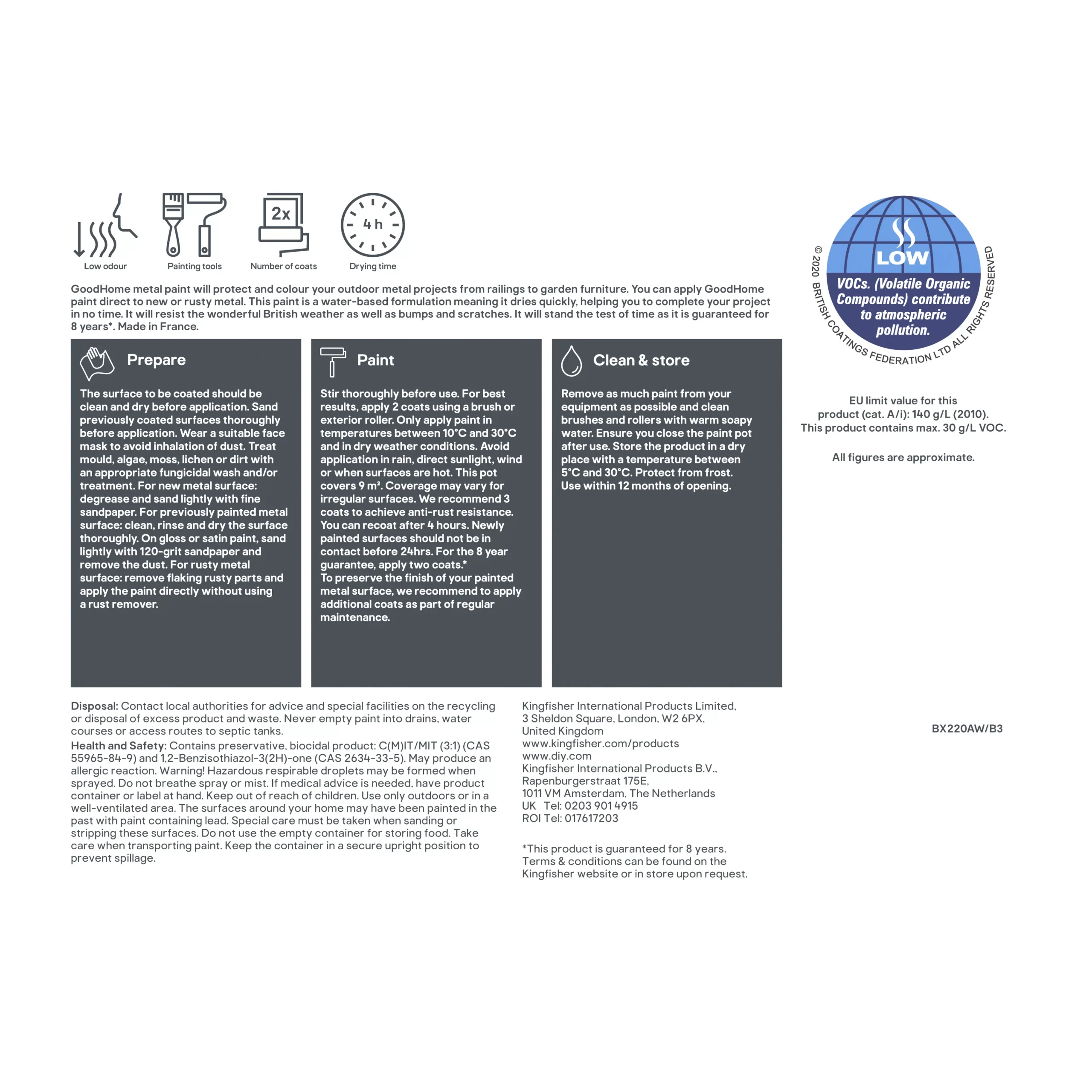A brilliant GoodHome exterior gloss metal paint that is a great choice to give your home a refresh. White is a clean colour that will suit any exterior design. The paint should ideally be used as a topcoat on ferrous and non-ferrous metal. After application, this metal paint will achieve a impeccably gloss surface that will look good as new for a long time. This 750ml size contains enough paint to cover up to 9 m² on average. For the best outcome, apply using a brush or roller. It will dry quickly between coats meaning you can recoat it in 4 hours. This paint offers top quality protection, designed to be resistant to rust, ultraviolet, and water, making it an ideal choice to use on surfaces outdoors. Furthermore, our metal paint is water-based and has minimal VOCs, so it’s safe for you and your home.